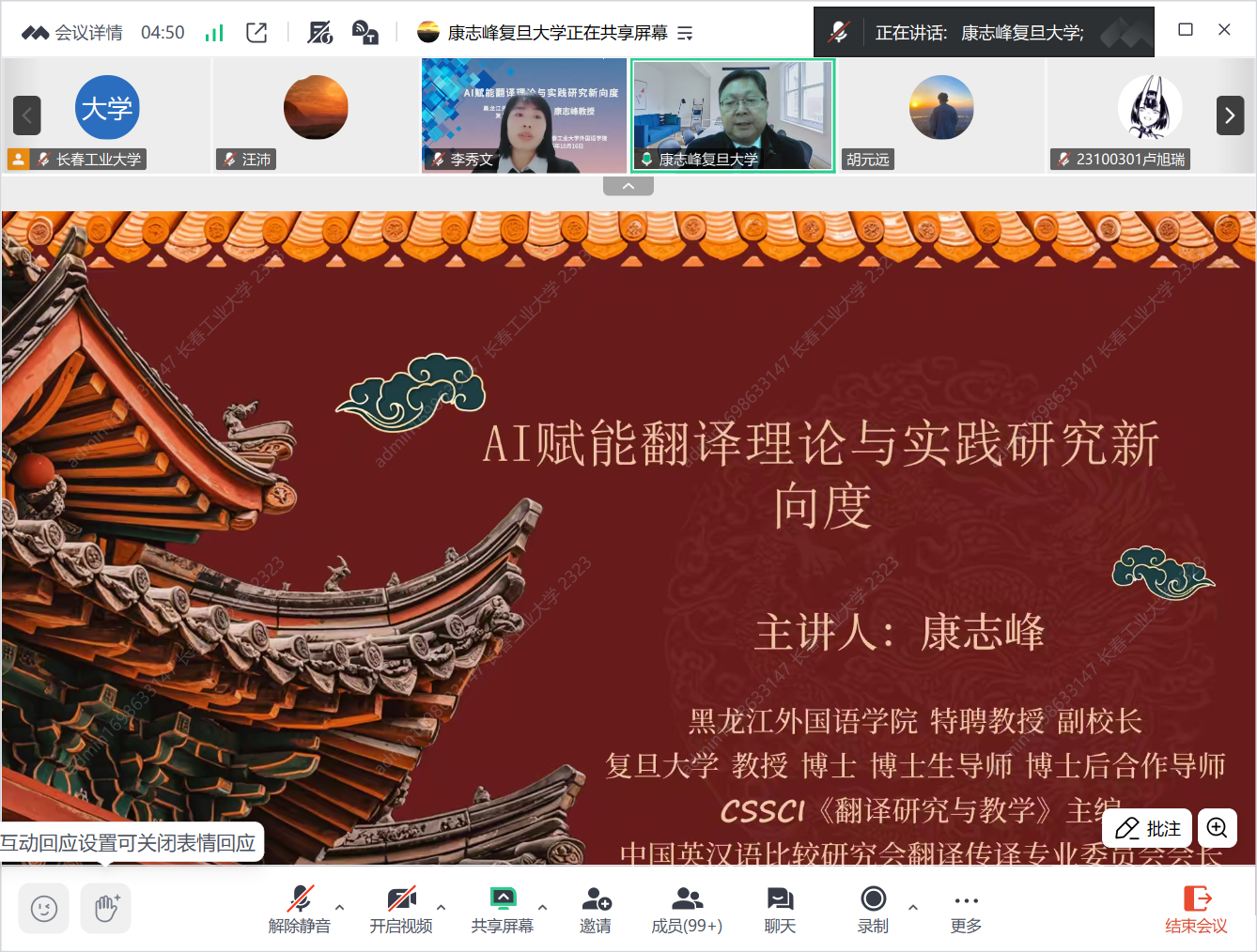 康志峰教授围绕“AI的迅猛发展为翻译领域带来了革命性变革,催生了理论与实践研究的新向度”这一主题 ,从AI+大翻(口)译、体认口译学溯源、体认口译学定义、论要解析1-4、视译眼动实验(福州大学)、带稿同传眼动实验(复旦大学)等六个方面,具体阐述了AI赋能下翻译研究范式如何进行转型,并鼓励在场师生思考:AI赋能下翻译研究在理论和实践层面如何进行创新?康教授强调:“未来的翻译研究应聚焦于人机智能的深度融合,探索构建新型翻译批评标准与人才培养体系,以应对数智时代的新挑战与新机遇。”
