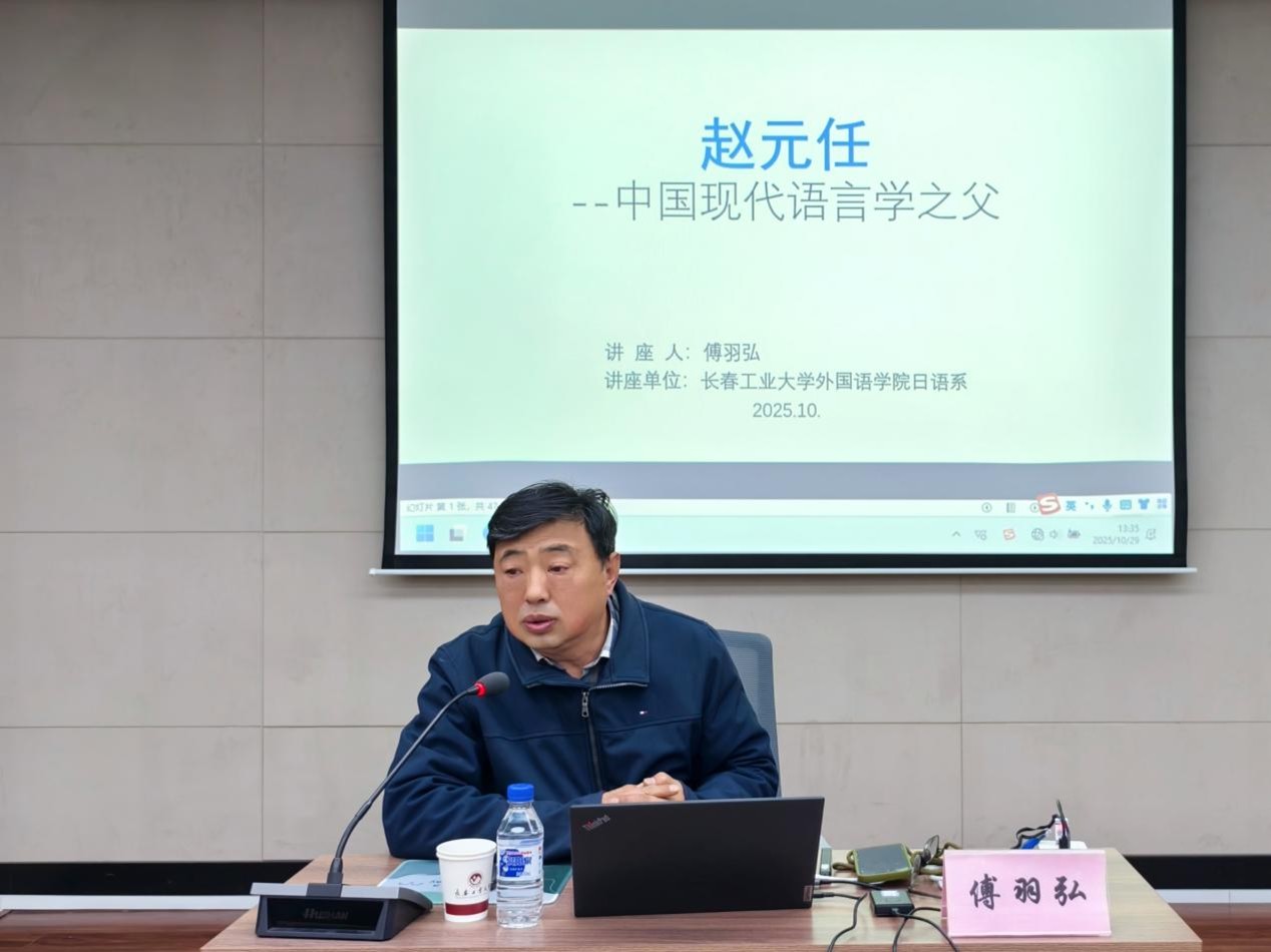 报告会上,傅羽弘教授对赵元任先生的学术成就展开系统解读。他介绍道:赵元任先生作为横跨语言学、数学、音乐等多个领域的学术巨匠,其最突出的贡献在于首次将汉语研究从传统训诂学转向现代科学范式。这一转变不仅改变了汉语研究的基本方法,更为中国现代语言学的发展奠定了坚实基础。并详细阐释了赵元任先生构建的三大科学体系,实验语音学体系的创新性建立、方言调查方法的科学规范化、汉语语法框架的系统搭建。通过这些开创性工作,赵元任成功奠定了语言学作为独立学科的地位。