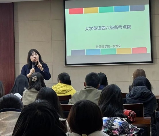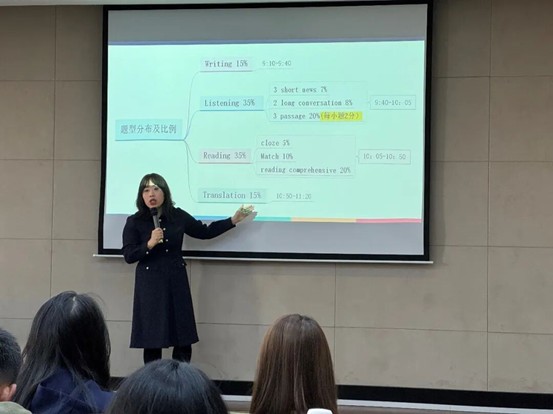 会上,李秀文以大学英语四六级考试命题规律为切入点,围绕听力、阅读、写作、翻译四大核心题型展开分层讲解。针对各题型的考查重点与命题特点,她结合历年真题案例,逐一拆解题干设置逻辑、选项干扰类型及答题关键得分点,帮助新生建立对考试题型的系统性认知。
